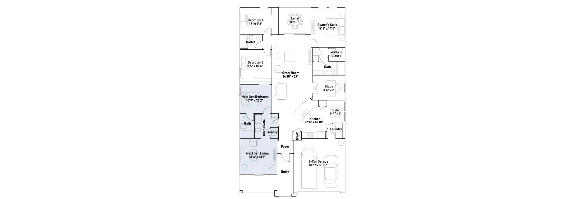 Este elegante modelo de casa térrea foi projetado para oferecer conforto e privacidade. Ele conta com uma suíte independente, equipada com sala de estar, kitchenette, quarto e banheiro, ideal para hóspedes ou familiares. No centro da casa principal, um espaçoso Great Room se conecta perfeitamente à cozinha, café e varanda coberta. Nas laterais, encontram-se um prático escritório e os quartos restantes, incluindo a tranquila suíte principal, que dispõe de um banheiro privativo.