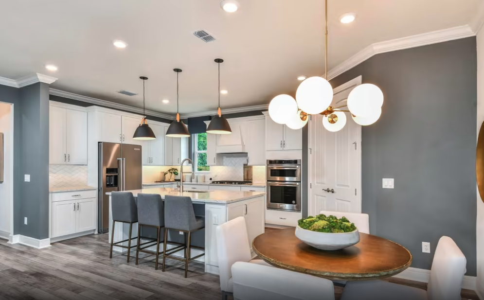 A Seaport é repleta de áreas de convivência abertas. A espaçosa sala de estar se conecta perfeitamente à cozinha, que inclui uma ilha central, tornando esse espaço tanto elegante quanto funcional. O loft no segundo andar oferece um amplo espaço para as crianças ou para uma sala de mídia, perfeita para reuniões em família.